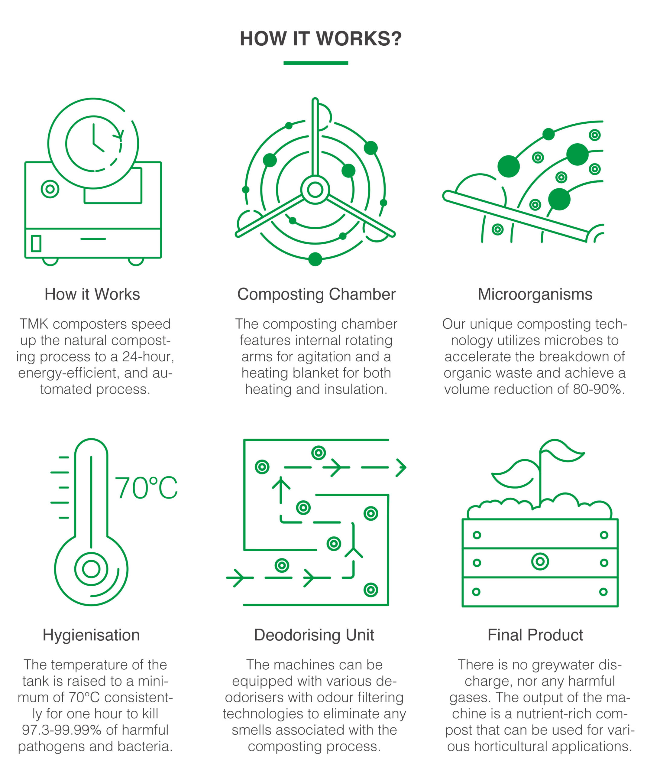 TMK-5000 Industrial Composter is designed for large-scale food industries for the disposal of various types of organic waste to reduce the risk of environmental pollution.