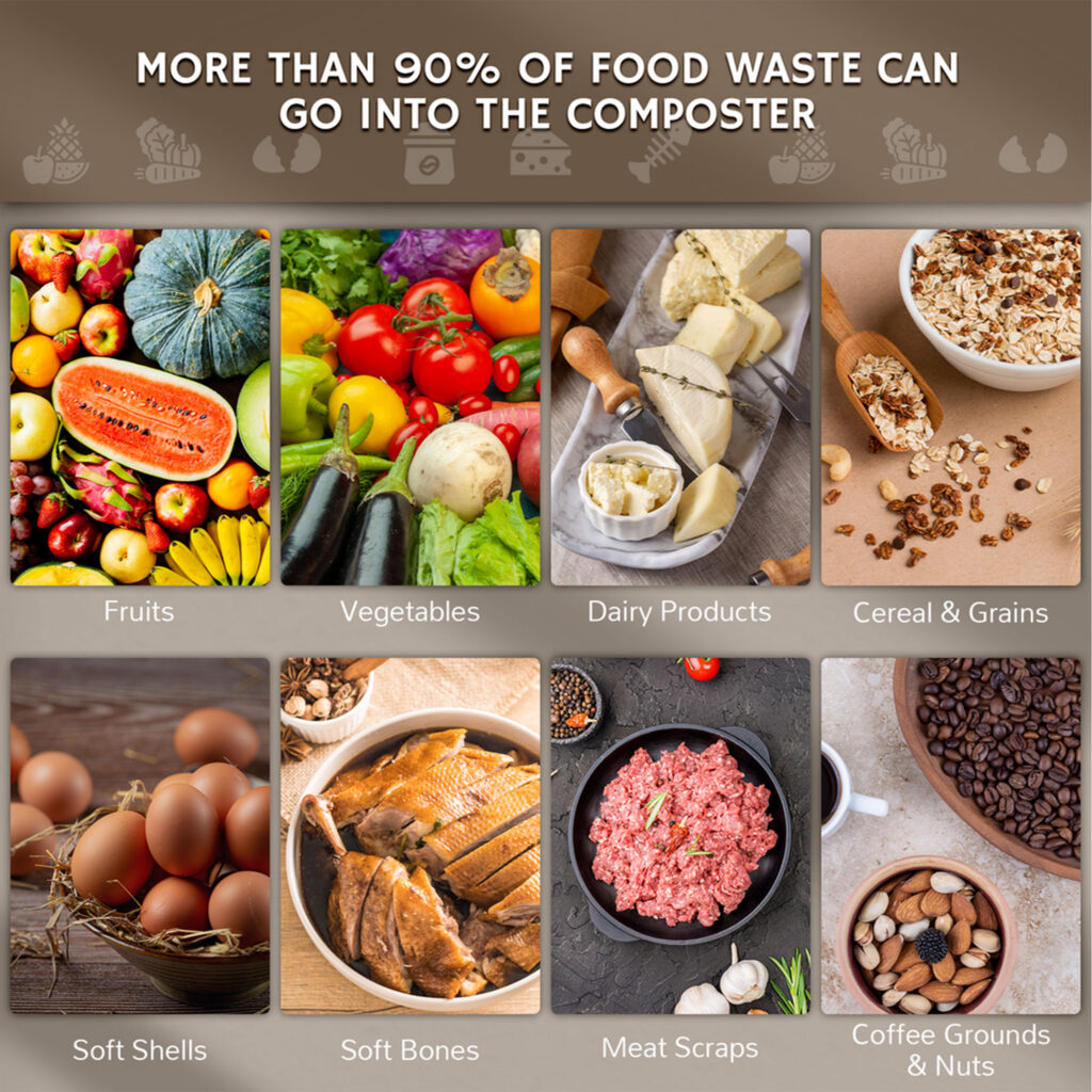 Waste can be put in: Vegetable Leaves, Leftovers, Vegetable Peel, Fish, Meat, Shrimp Shells, Crab Shells, Egg Shells, Small Bones, Bread, Coffee Grounds, etc.